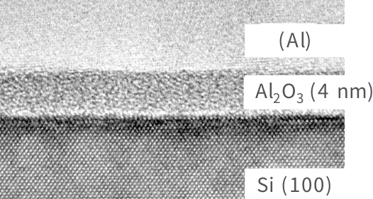 Cross sectional TEM image of an Al2O3 film with a tiny yet extremely homogeneous and dense interface to the other layers Si and Al. Coated with an ECR plasma sputter coating tool.
